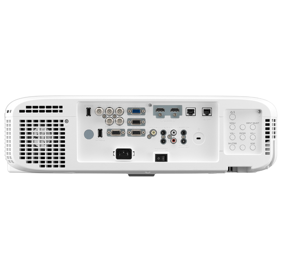 - Các cổng kết nối: HDMI in 19-pin x 2, Lan RJ-45 x 1 for network connection 10Base-T/100Base-TX compatible with Art-Net, PJLink™(Class 1), VGA in x 1, Serial In x 1, VGA out x 1, USB type A DC out SV 900mA, USB type A wireless x 1, Video in x 1, Audio in x 1, Audio out x 1,