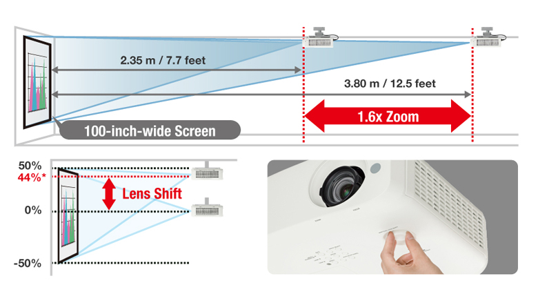 - Độ sáng: 5.500 umens. Tuổi thọ bóng đèn: 7.000 h (Eco), công suất bóng đèn: 280 W.