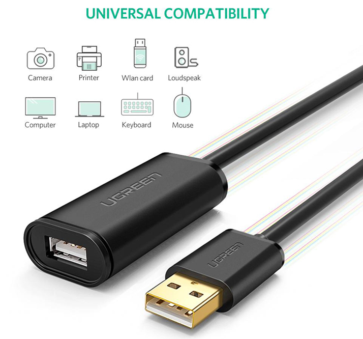 Ugreen UG-10323 cáp USB nối dài 15m có chíp khuếch đại chính hãng có thể được sử dụng để mở rộng các thiết bị USB của bạn, như máy in USB, loa, máy quét, bàn phím, wifi, camera online với chuẩn USB 2.0 dài 15m.