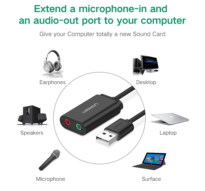 Cáp chuyển USB Ugreen 30724 là thiết bị lý tưởng để thêm 1 cổng audio 3.5mm và 1 cổng mic 3.5mm cho máy tính, laptop, Macbook, tivi box. Giải pháp hoàn hảo để thay thế cổng Audio 3.5 bị hỏng hoặc bổ sung cho những thiết bị không trang bị cổng âm thanh này.